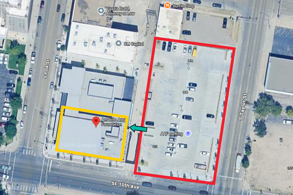 Do not enter from the S. Polk St. side of the building, and DO NOT ring the building’s buzzer. Instead, enter from the parking side – parking is marked in red on the map below, and the building entrance with a green arrow.