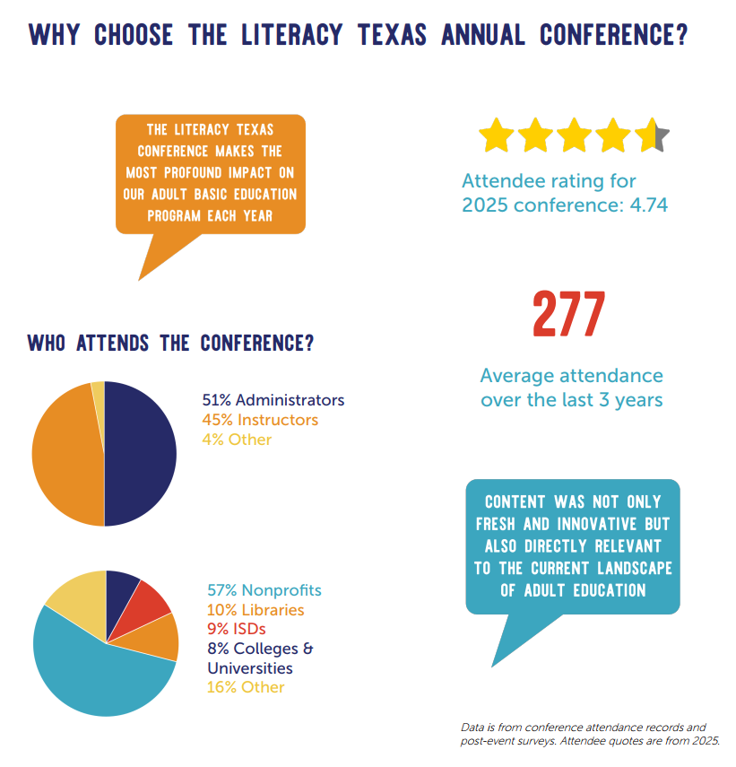 We’re expecting attendees from every corner of Texas – and beyond! – representing the wonderful diversity of our field: nonprofits, corrections programs, library systems, ISDs, workforce boards, community colleges, faith-affiliated organizations, and so many more. These are the people doing the essential work of shining the light of literacy and creating opportunities through education.